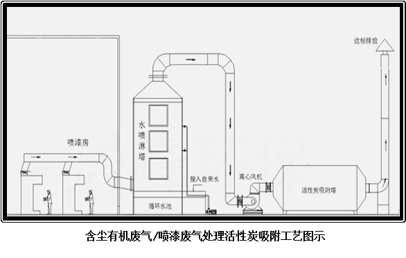 噴漆廢氣產(chǎn)生于工件涂裝的噴漆工作臺,高壓空氣噴射出的油漆大部分留在工件上,其它的隨著廢氣帶出,形成漆霧粉塵。